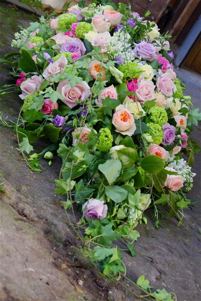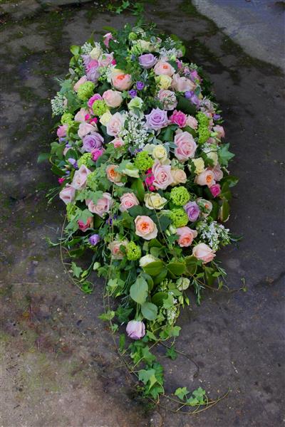 A beautiful casket of mixed roses including garden roses and luxury fillers.