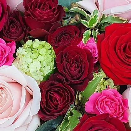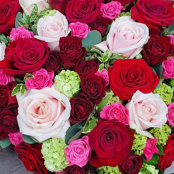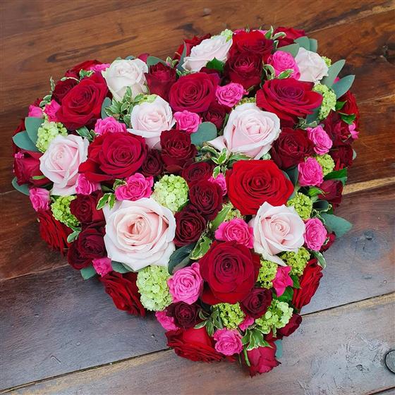 A closed-heart funeral tribute filled with red, blush pink and fuchsia roses, softened with touches of lime green blooms and seasonal foliage. This vibrant design expresses love, gratitude and heartfelt remembrance in every stem. A stunning floral farewell, handcrafted with care to honour someone deeply treasured and beautifully remembered.