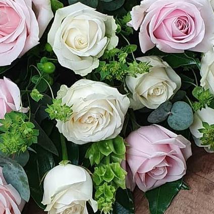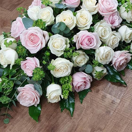 A soft and elegant casket spray created with blush pink and ivory roses, green bell foliage, viburnum and lush greenery. A beautifully balanced funeral tribute with a gentle colour palette to express love, gratitude and peace.
