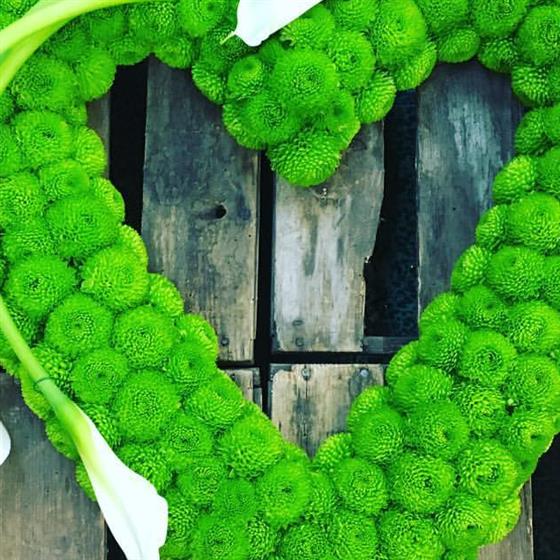 A bold and contemporary heart-shaped tribute made from vivid green blooms, finished with elegant white calla lilies. A fresh, modern way to say goodbye with grace.