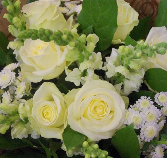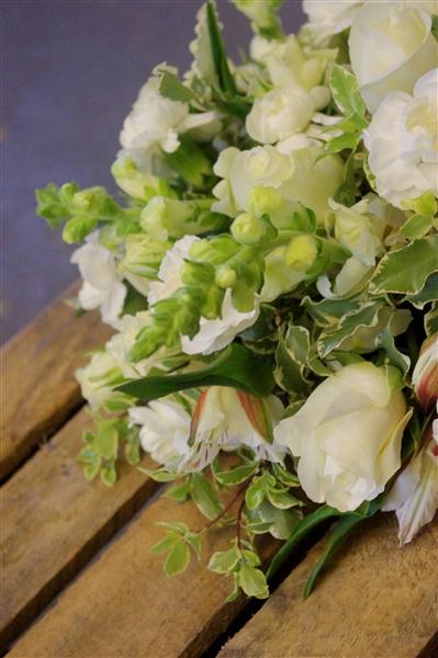 A collection of white and cream flowers with roses, combine to create a simple and beautiful tribute. Exact content may vary according to availability of fresh materials, however our skilled florists will substitute flowers according to value and style.