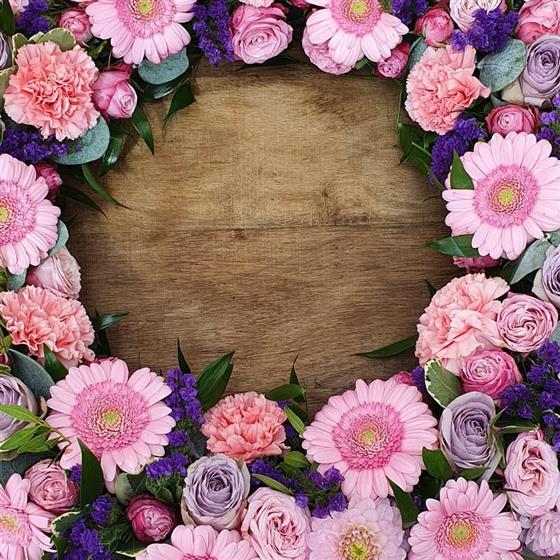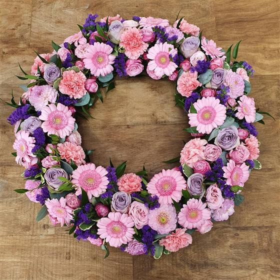A full wreath tribute in shades of pink and lilac, arranged with roses, gerberas, and statice. A delicate floral design to express love, memory, and peace.