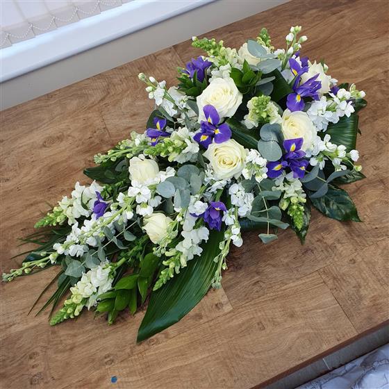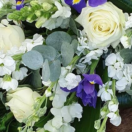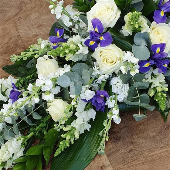 A soft and elegant spray featuring creamy roses, white blooms and vibrant purple iris. Delicately balanced with eucalyptus and fresh greenery for a serene, natural farewell.