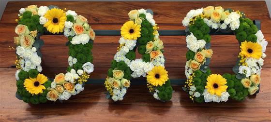 A natural garden-style tribute for Dad, arranged with fresh yellow germini, golden roses, and soft white accents set against a green mossy base. Gentle, warm and full of love.