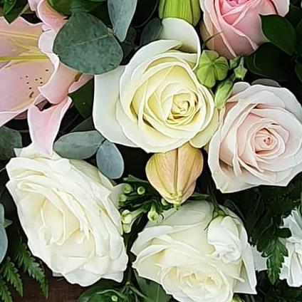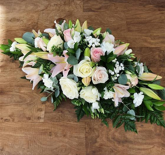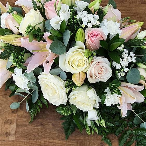 A soft and graceful casket spray featuring blush pink lilies, cream roses, white lisianthus, carnations and eucalyptus. This gentle arrangement offers a peaceful and elegant tribute, beautifully styled to honour a life with subtle beauty.