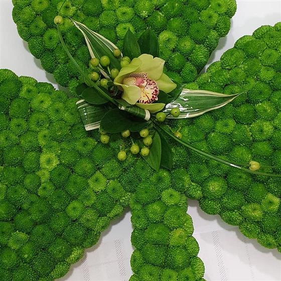 This vibrant shamrock tribute is crafted with fresh green blooms, featuring a central spray for added detail. A fitting floral farewell for someone proud of their Irish heritage or love of Celtic tradition.