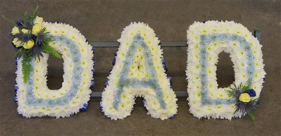 A 3 Letter Massed Tribute with an inlay of flowers in a colour of your choice. Please specify colour and word required at the time of ordering. Available with ribbon or foliage edging.