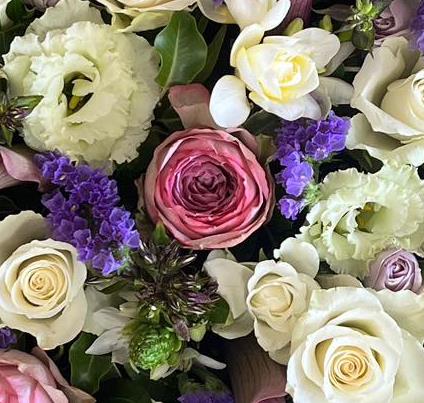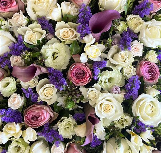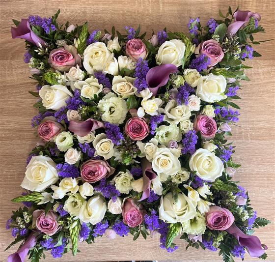 A classic funeral cushion of lilac, cream and soft mauve tones, beautifully arranged with roses, lisianthus, and seasonal flowers. A respectful floral tribute handcrafted by us your local funeral florist. Order funeral flowers online with care.
