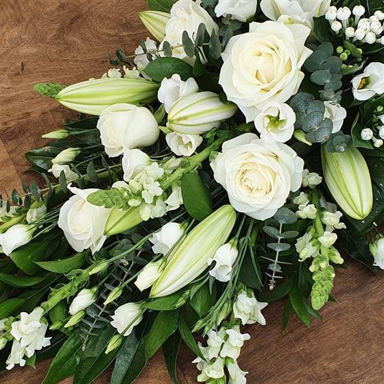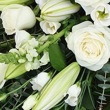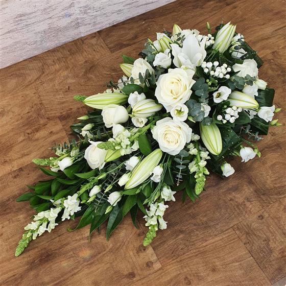 An elegant all-white casket spray crafted with roses, lilies and soft seasonal flowers, arranged with eucalyptus and fresh foliage for a classic, peaceful tribute.