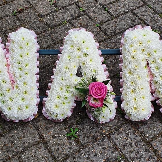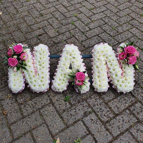 A beautiful NAN tribute in white chrysanthemums, with pink roses and soft blush ribbon. A gentle and loving design, perfect for remembering a truly special nan.