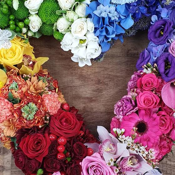 A striking open heart tribute arranged with flowers in every colour of the rainbow. Bright, joyful and full of meaning, this is a beautiful celebration of life and love.