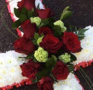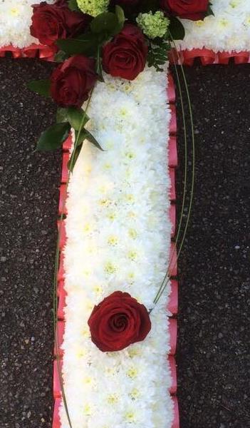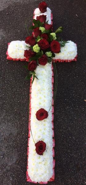 This traditional funeral cross is edged with ribbon and filled with white chrysanthemums, featuring a bold red rose spray for a loving and heartfelt tribute.