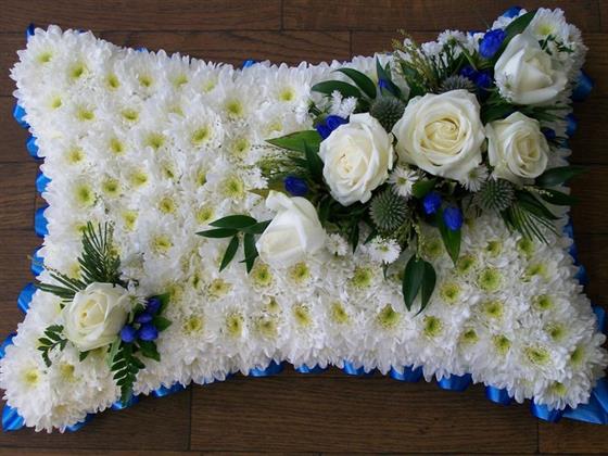 A traditional funeral pillow featuring white chrysanthemum base with white roses and blue accents. A meaningful way to send funeral flowers for a loved one.