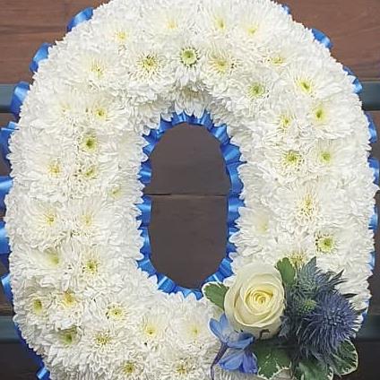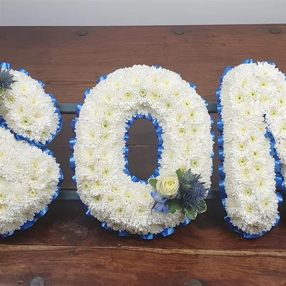This floral letter tribute spells out ‘SON’ in white flowers edged with blue ribbon, finished with soft sprays of ivory roses, thistles, and delphinium. A dignified and loving farewell.