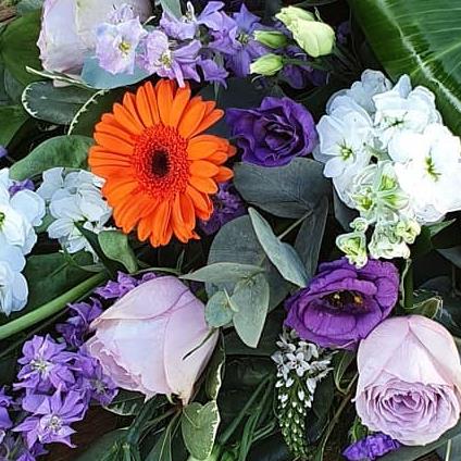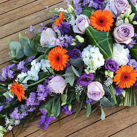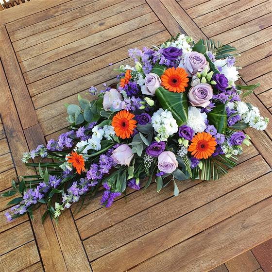 A bold and beautiful casket spray combining rich orange gerberas, lavender roses and purple blooms, arranged with tropical palms and natural greenery in a flowing teardrop shape.
