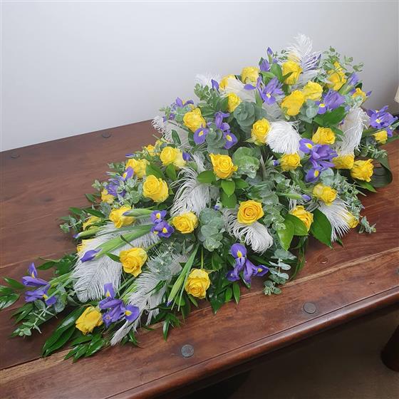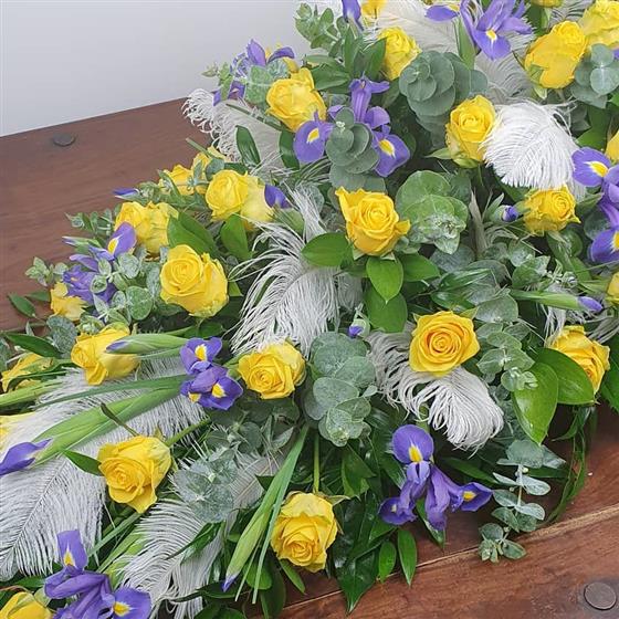 A dramatic casket spray with yellow roses, purple irises, white feathers and fresh greenery. Elegant and expressive, a final tribute filled with colour, grace and movement.